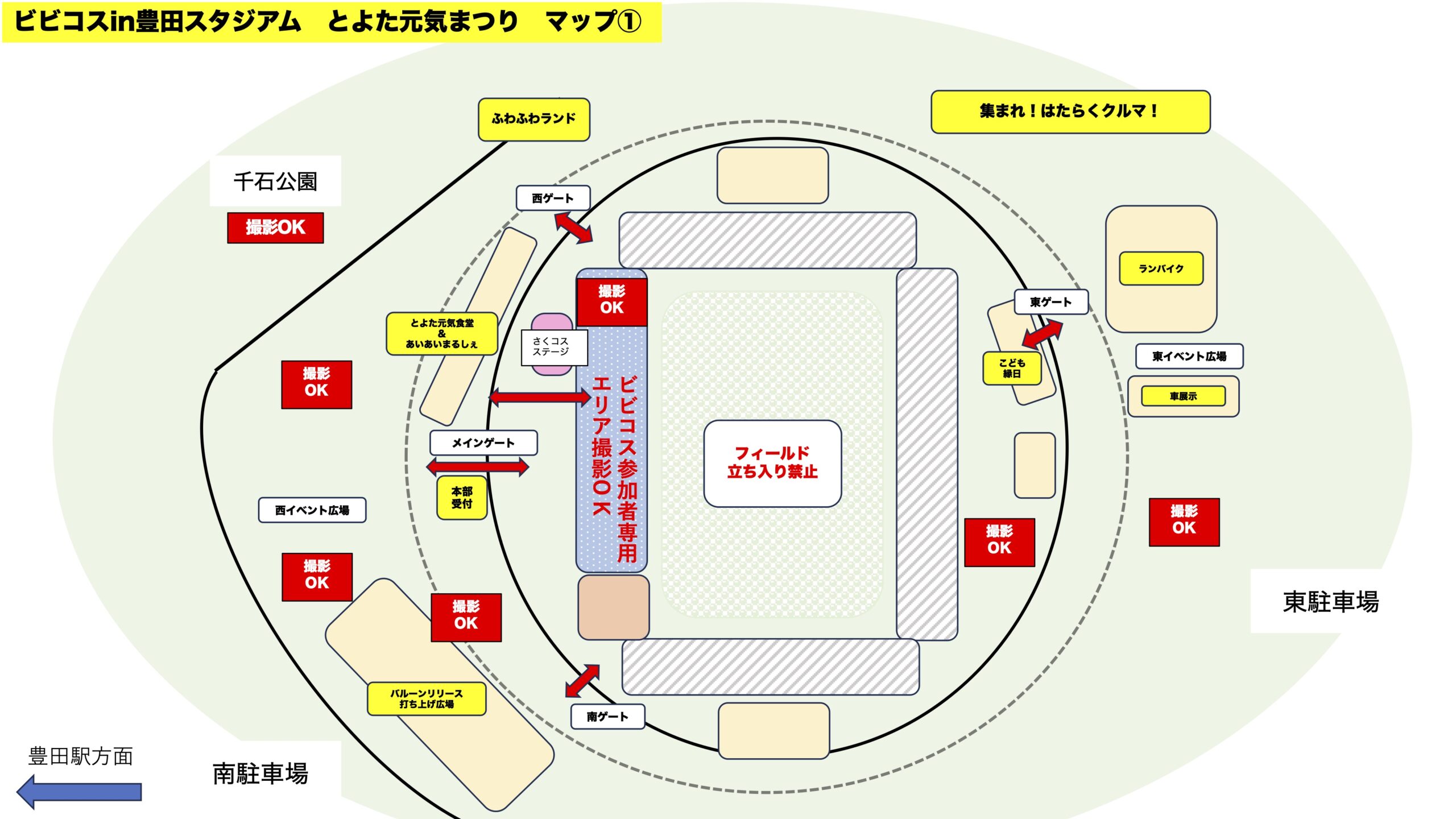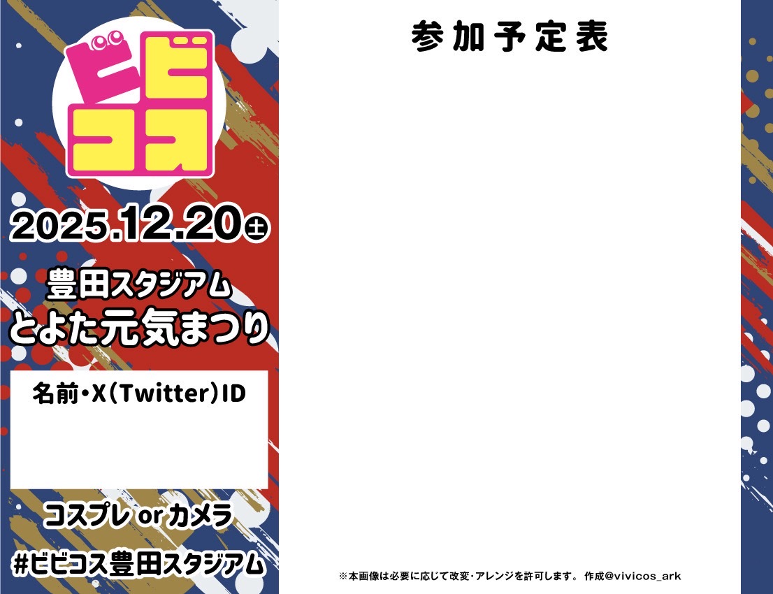 ※撮影もコスプレもされない方のスタジアム内入場は「とよた元気まつり」現地にてまつりの入場チケット500円のご購入が必要となります。(参加コスプレイヤー様の撮影を目的としてご来場される方はスマートフォンや携帯電話であってもビビコスの参加チケットご購入が必要となります。)