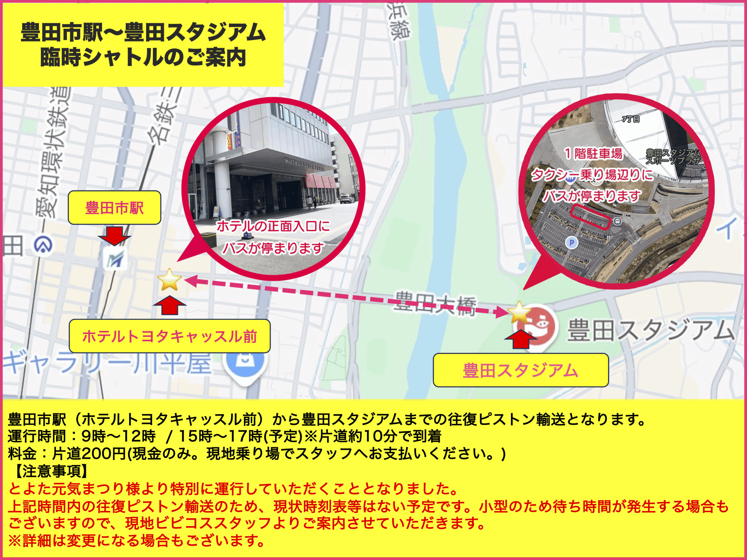 とよた元気まつり様より、豊田市駅と豊田スタジアムを往復する臨時シャトルご用意いただきました!ぜひご利用ください!