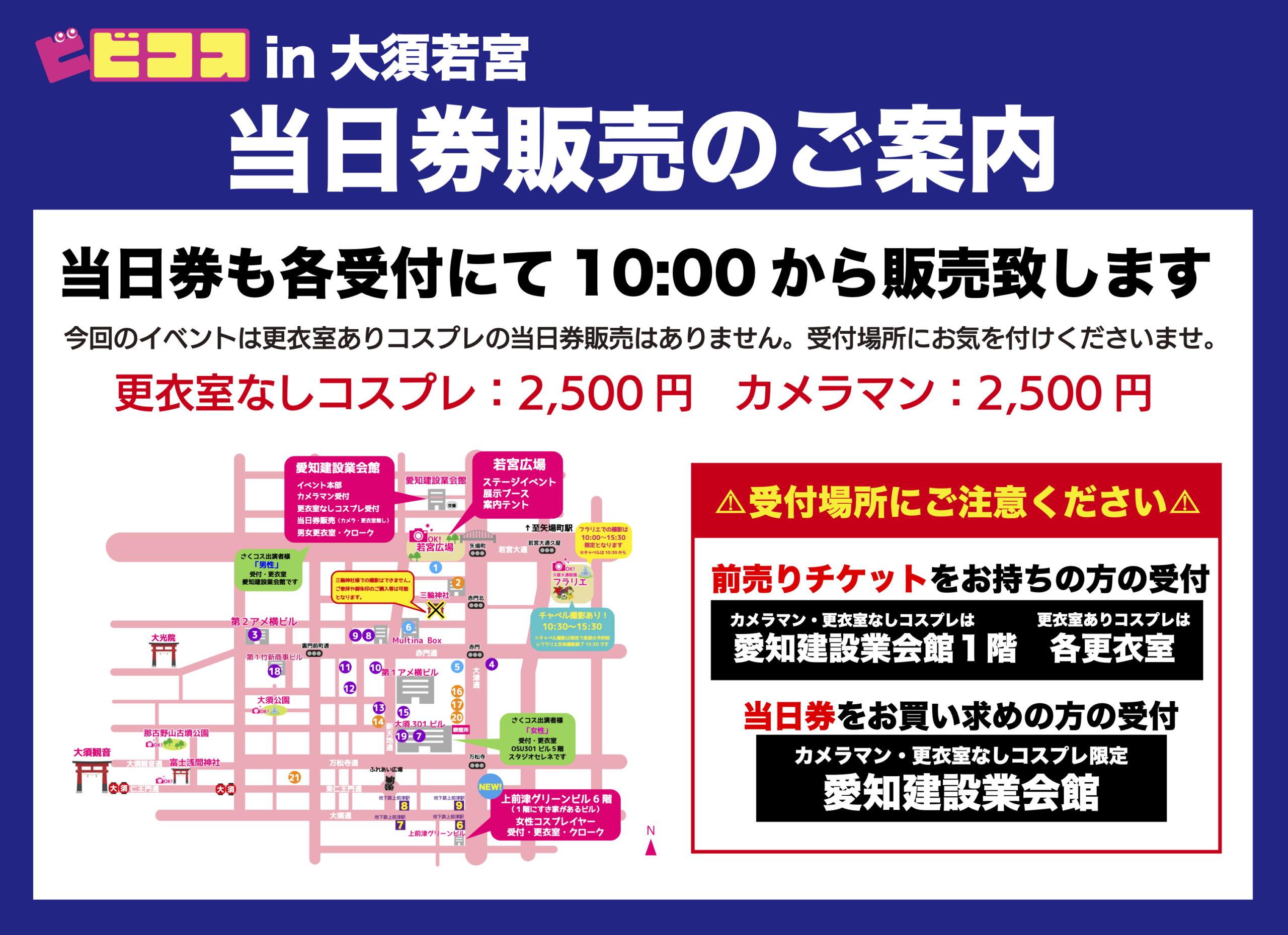 ・更衣室を利用されないコスプレイヤーの方は若宮広場本部が受付となります。(当日券購入の方は愛知建設業会館)そちらで衣装チェックも行いますので、お着替えを済まされた状態でお越しください。