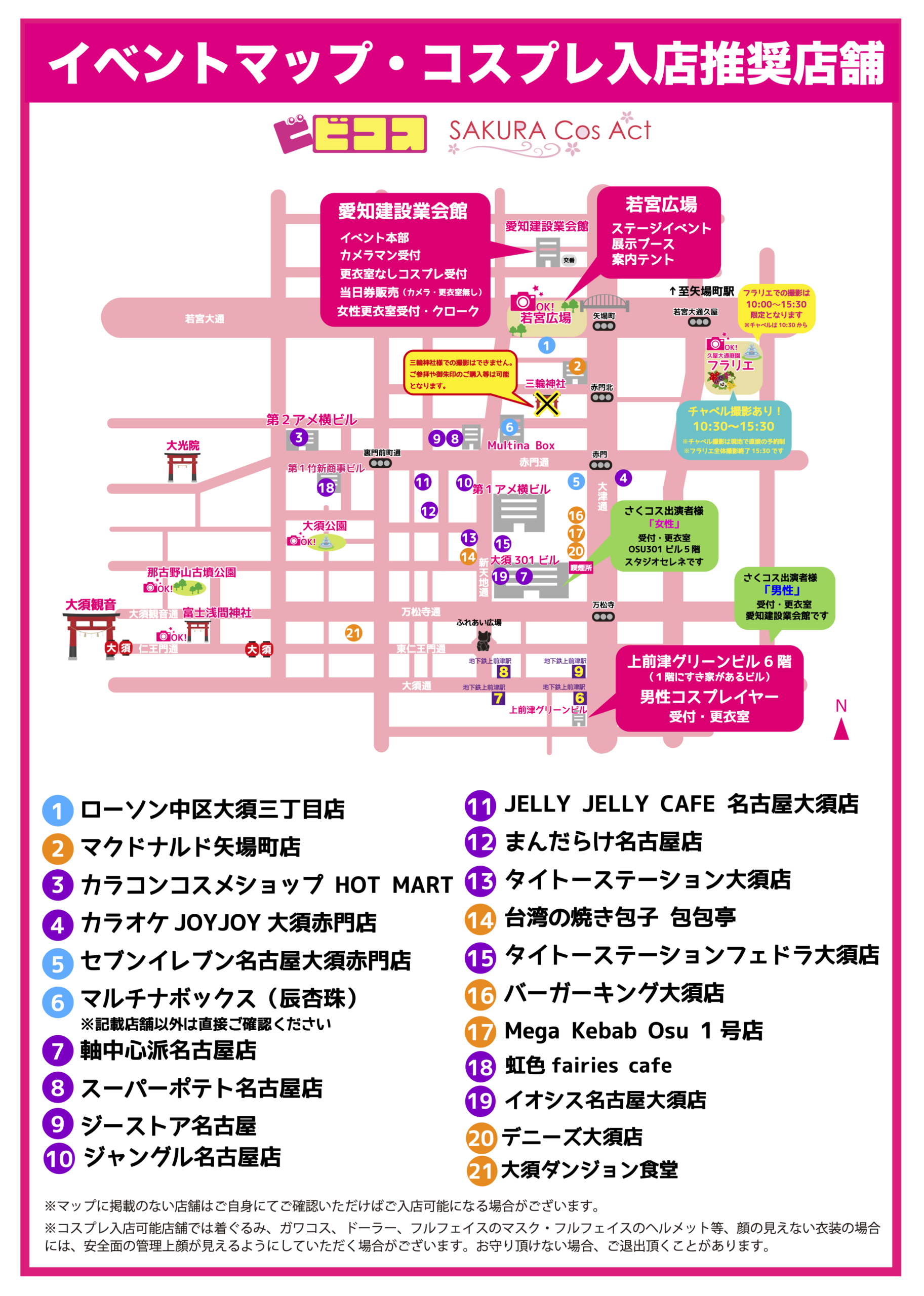 ・様々な対策を施して頂いた場合でも、衣装によって、フラリエ、大須商店街やコスプレ入店可能店舗でも、施設や店舗側の判断によりお声掛けさせて頂く場合があります。ご心配な方はお気軽にビビコス実行委員会までお問い合せ下さい。