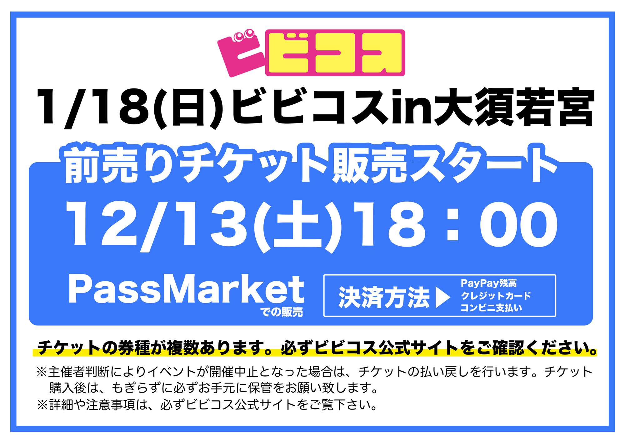 ビビコスの参加チケットは、プレイガイドである「パスマーケット」へ販売委託をさせていただいております。