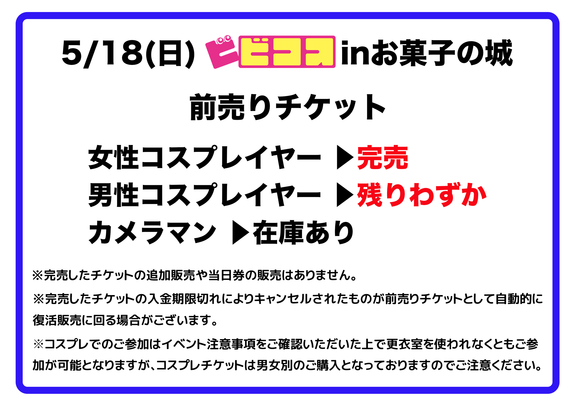 コスプレチケットは前売りの状況で販売無しになる事があります。