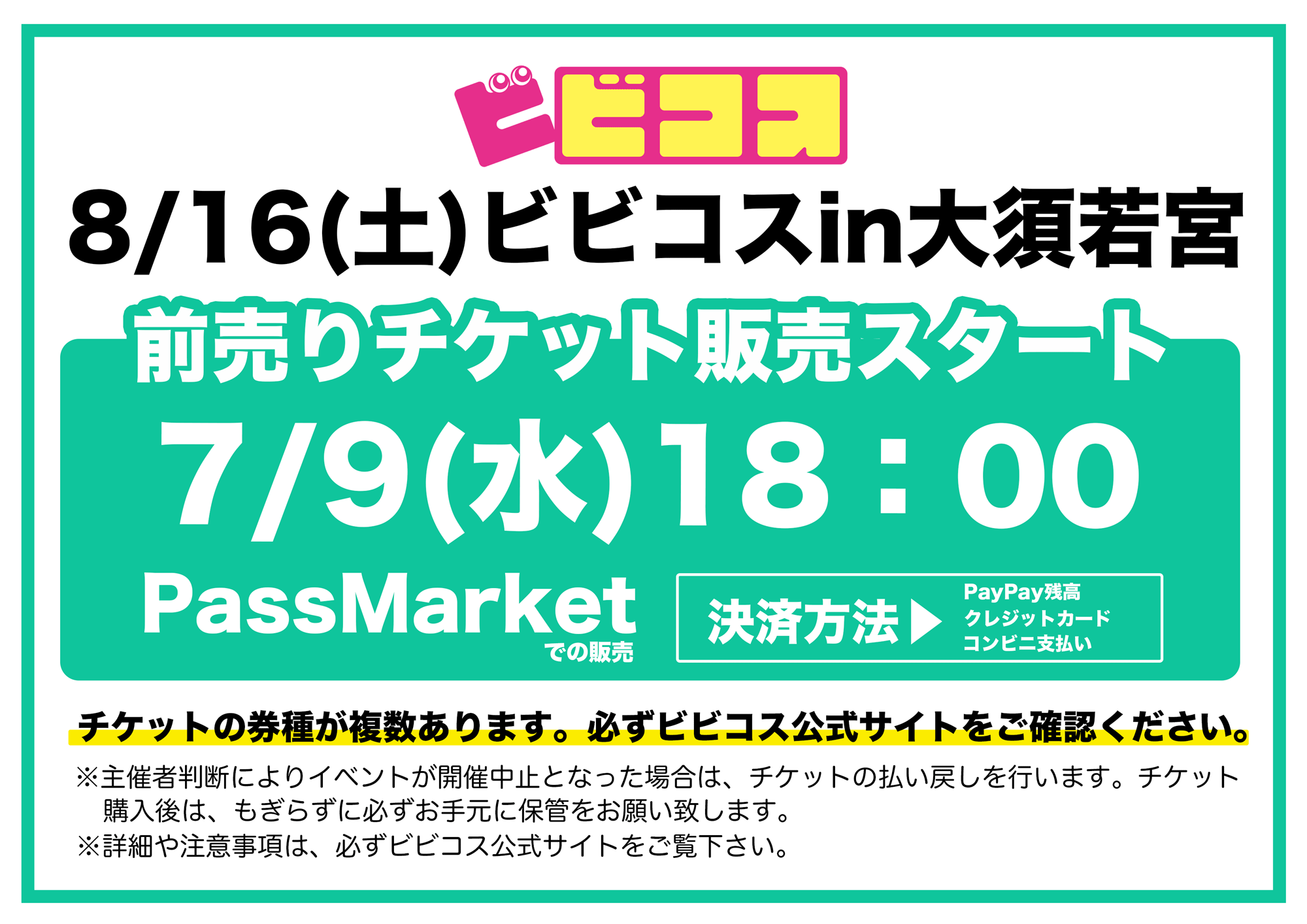ビビコスの参加チケットは、プレイガイドである「パスマーケット」へ販売委託をさせていただいております。